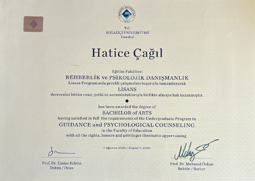 Rehberlik ve Psikolojik Danışmanlık lisans eğitimini 2020 yılında Boğaziçi Üniversitesi’nde tamamlamıştır. Lisans eğitimi süresince Birey Aile Çocuk Terapileri Enstitüsü (BAÇTE)’nde staj yaparak Virginia Satir Aile Terapisi eğitim kitapçığı çevirisi ve danışan gözlem çalışmaları yürütmüştür.